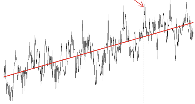 If you look at the data represented by this chart, starting with where the red arrow is pointing, it looks like there’s a huge drop in whatever this chart is tracking. From single data point to the next, there’s a steep decline. But as you keep looking at the data, it’s not actually clear what’s going on. The data is noisy. Up, down, up, down, big drops, big rises, it’s pretty much impossible to make sense of what’s happening if you’re zoomed in too close. But if you pull back, and take a longer view, it’s obvious what’s happening. The direction of change is clear. At the Institute for the Future, we say that it’s virtually impossible to predict what will happen in the very short-term. But if you zoom out, it’s much easier, to see where we’re likely to be headed in the long-term.