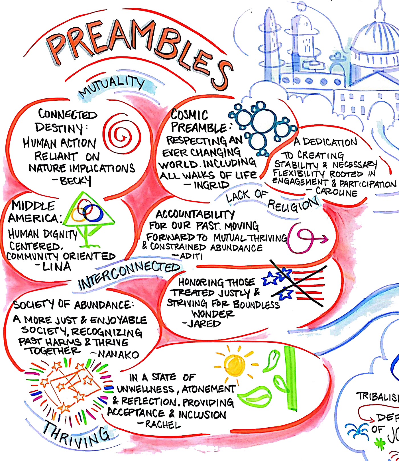 Preambles, like the preamble to the U.S. Constitution, are mission statements for the kind of world that is to be wrought by the design of the Constitution that follows it. We looked at dozens of preambles from other nation-state constitutions as well, many built in the aftermath of tragedy and violence that destroyed the previous order.