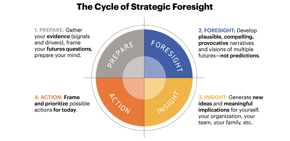 Our Prepare-Foresight-Insight-Action framework is the cornerstone of our Future Readiness Services and is supported by over 50 years of IFTF research. This framework, which IFTF customizes for its partners, provides a systematic approach to anticipating and analyzing foreseeable patterns that effect change.